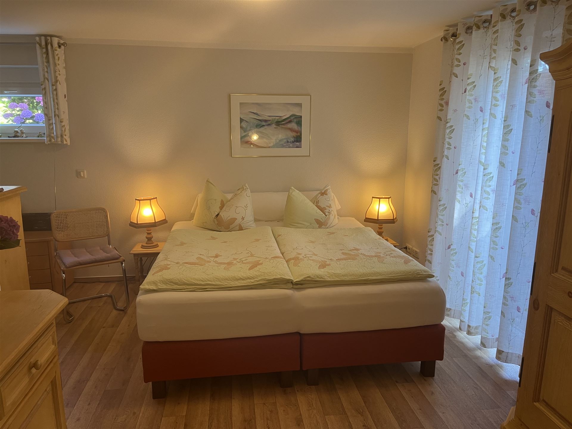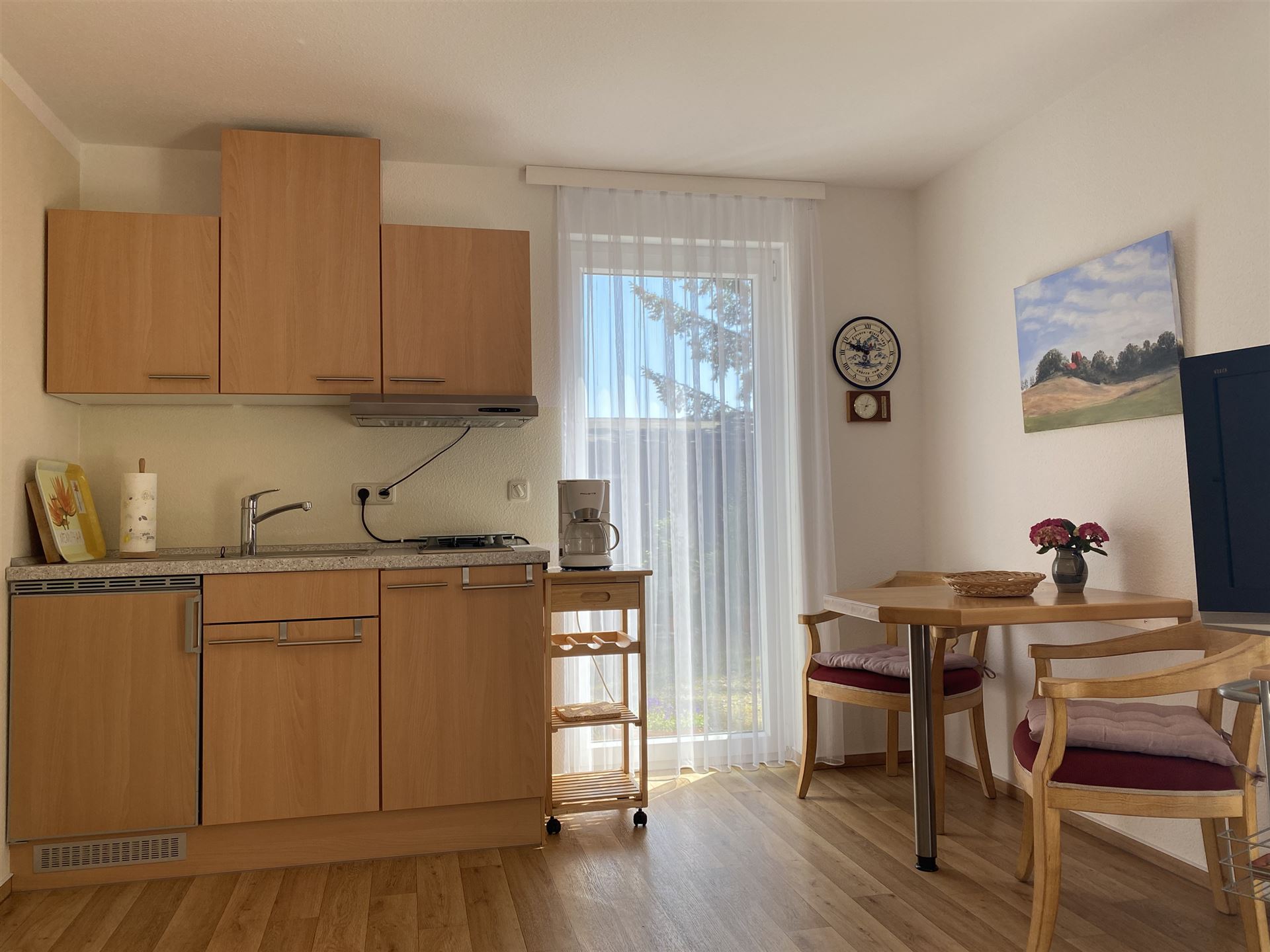 Die Ferienwohnung bietet Platz für 2 Personen auf ca. 50 Quadratmetern. Sie befindet sich im Erdgeschoss und ist gemütlich eingerichtet. Separat verfügt sie über ein modernes Bad mit Dusche und WC, sowie über einen kleinen Wohnbereich mit einer Kochnische.