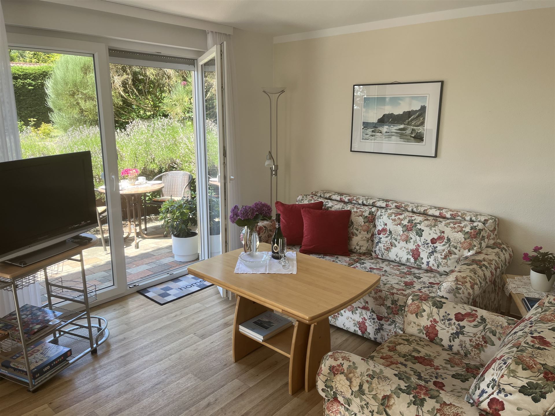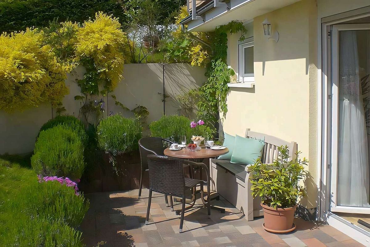 Direkt vor dem Wohnbereich geht es zur Terrasse, die gemütliche Abendstunden bei vielleicht einem Glas Wein garantiert.