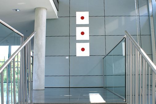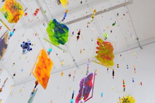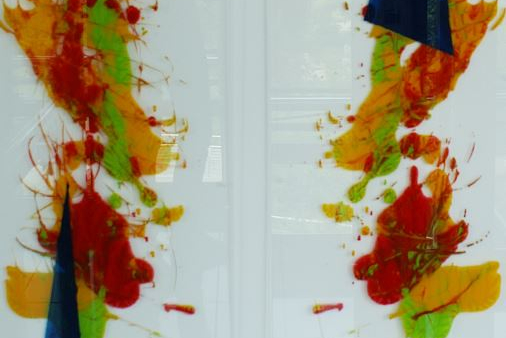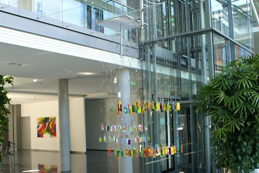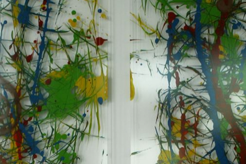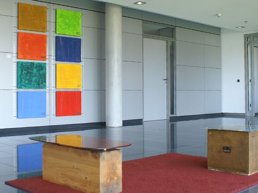 Licht spielt immer wieder eine Rolle in ihren Arbeiten. In diesem Fall werden bemalte Plexiglasscheiben vom Hintergrund beleuchtet, sodass eine ganz spezielle Lichtsituation im Raum entsteht.
