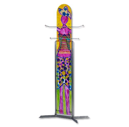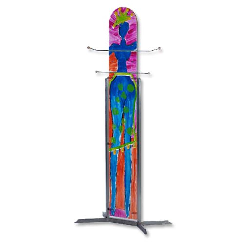 Außerdem hat sie eine besondere „Aufhängung“ aus Acrylglas entwickelt. Mit nur wenig Angriffspunkten (Bohrungen) an der Wand, können mehrere Werke ausgestellt und unterschiedlich kombiniert werden.