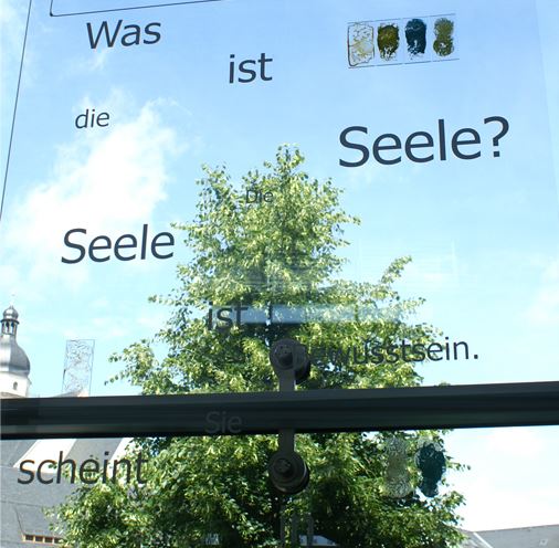 Licht spielt immer wieder eine Rolle in ihren Arbeiten. In diesem Fall werden bemalte Plexiglasscheiben vom Hintergrund beleuchtet, sodass eine ganz spezielle Lichtsituation im Raum entsteht.